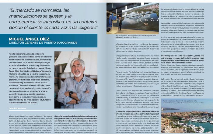 Puerto Sotogrande presenta una entrevista con su director gerente, Miguel Ángel Díez, en la que se abordan los valores que definen el modelo de la marina, su ubicación estratégica entre dos entornos naturales singulares, la amplitud de servicios disponibles y el compromiso con la sostenibilidad, la calidad y la atención al cliente que posicionan al puerto como referente en el ámbito náutico europeo.