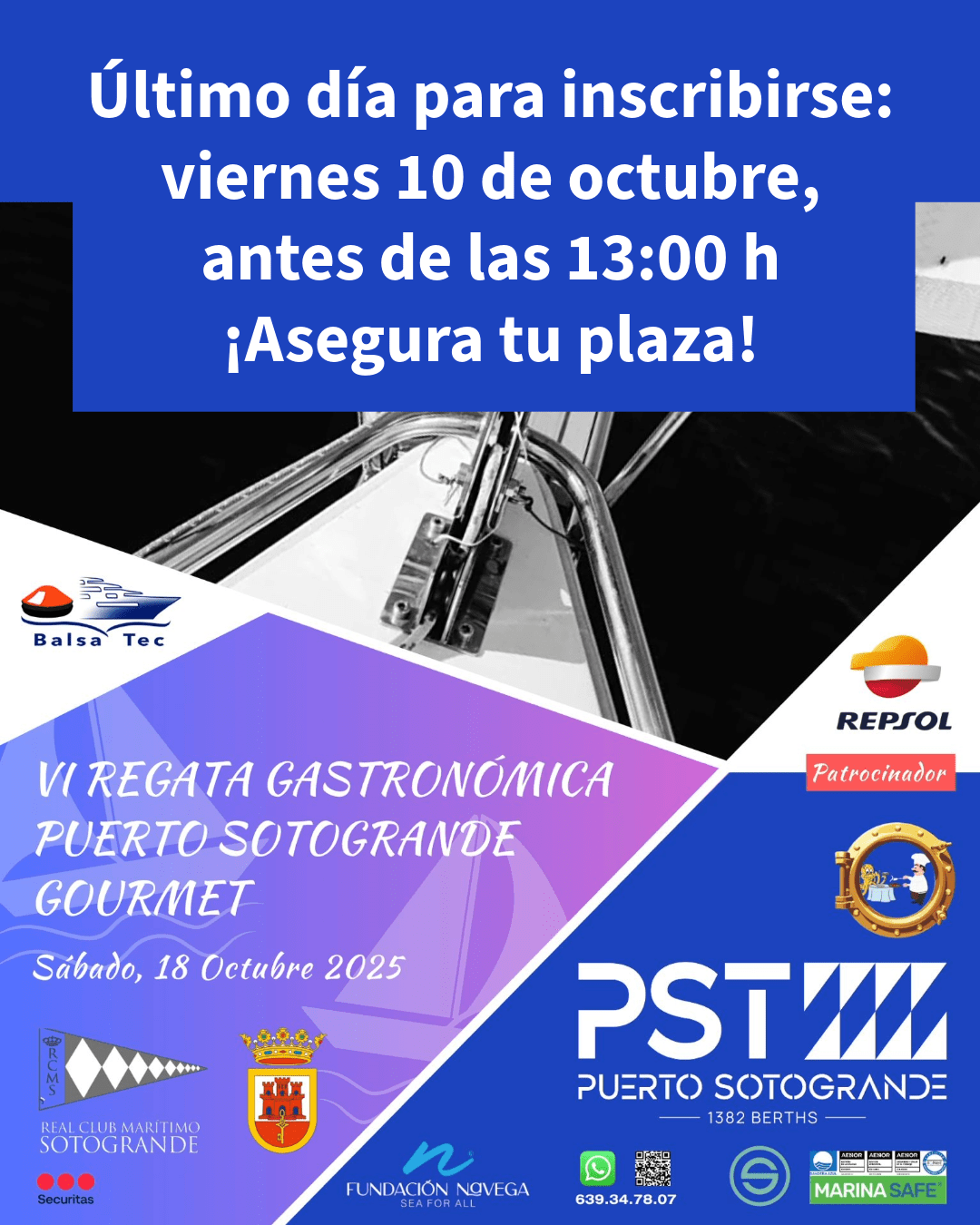 Las inscripciones se pueden hacer hasta mañana viernes 10 de octubre a las 13:00 horas contactando con el Real Club Marítimo Sotogrande a través del correo electrónico rcms@rcms.es o del teléfono móvil ‪+34 648 444 930‬, o bien contactando también con el propio Puerto Deportivo Sotogrande.