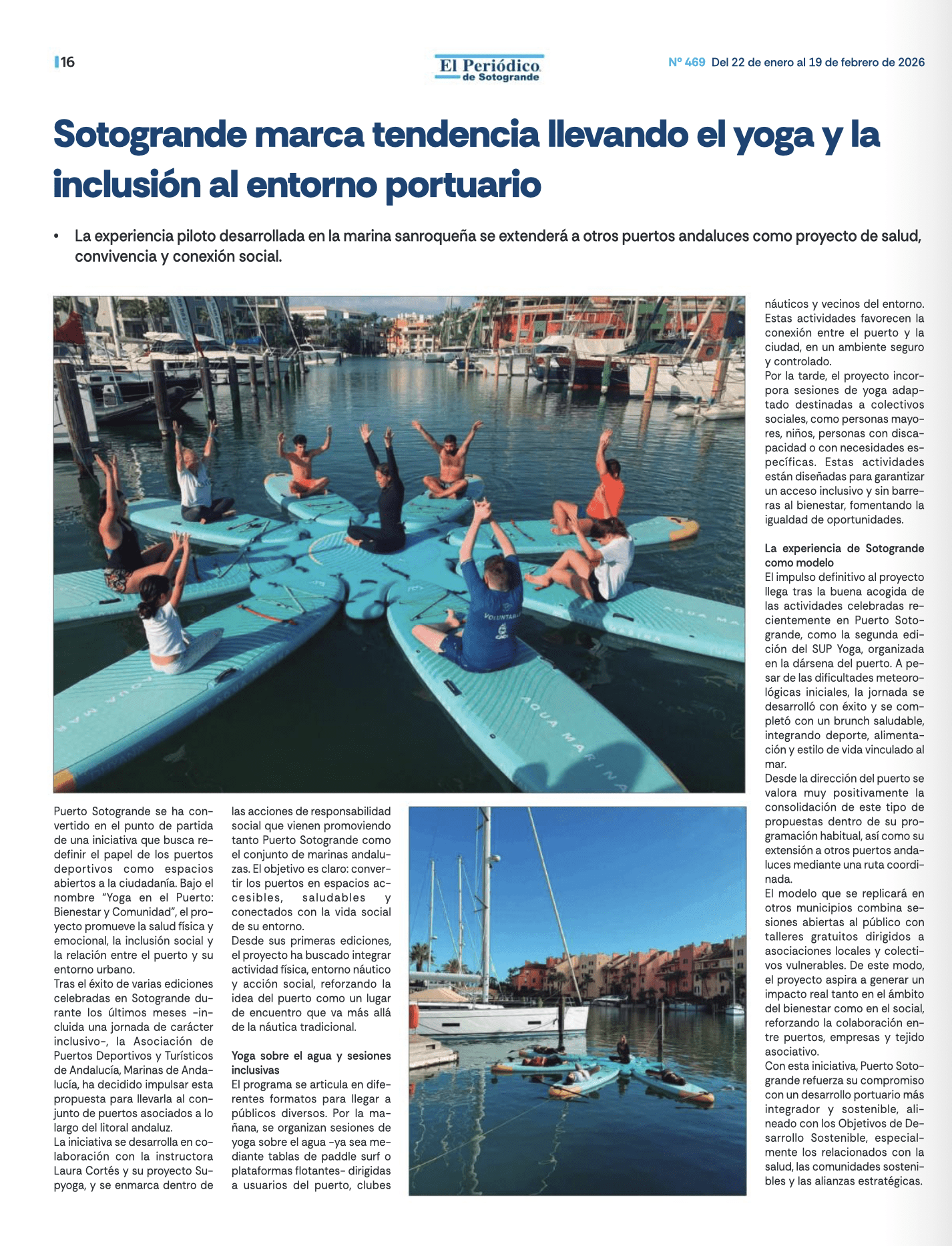 Sotogrande, 10 de febrero de 2026.- La iniciativa de yoga inclusivo desarrollada en Puerto Sotogrande ha sido recientemente destacada en la edición 469 de El Periódico de Sotogrande, correspondiente al periodo comprendido entre el 22 de enero y el 19 de febrero de 2026, reforzando así la visibilidad y el impacto social de esta acción pionera en el ámbito portuario.
