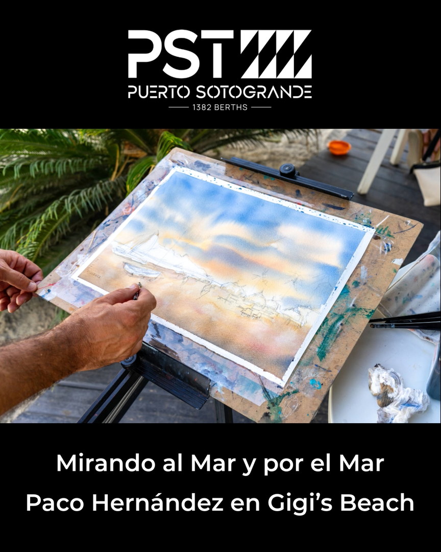 Sotogrande, 12 de agosto de 2025.- La propuesta cultural “Mirando al Mar y por el Mar” que ha puesto en marcha este verano Puerto Sotogrande y Fundación Navega celebra una nueva sesión en Gigi’s Beach, donde el artista Paco Hernández desarrolló una acuarela inspirada en el paisaje marítimo de Sotogrande y su Costa Natural que la hace única.