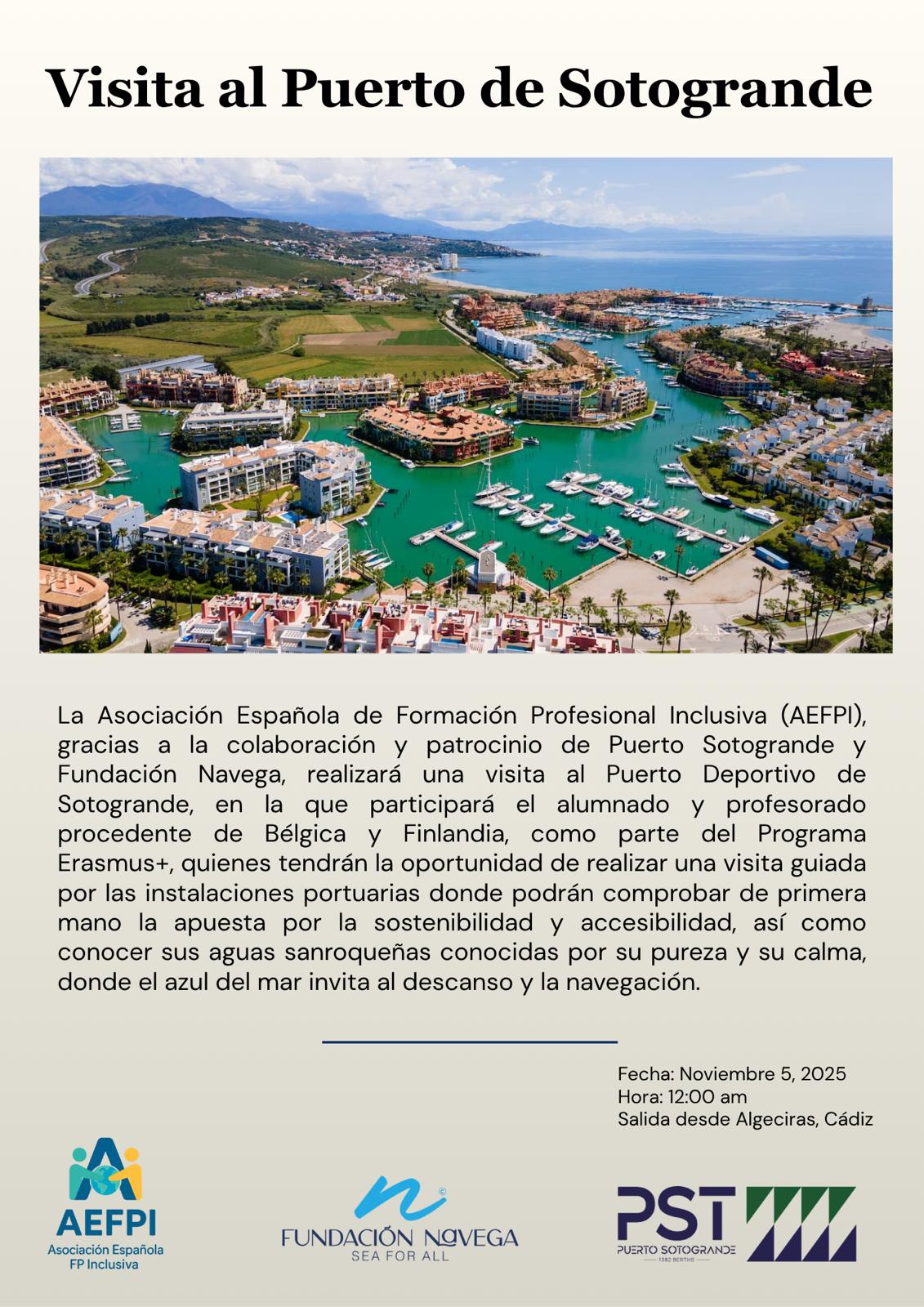 Sotogrande, 4 de noviembre de 2025.– El Puerto Deportivo de Sotogrande recibirá mañana miércoles la visita de alumnado y profesorado participante en el programa europeo Erasmus+, procedentes de Finlandia y Bélgica, en una jornada organizada por la Asociación Española de Formación Profesional Inclusiva (AEFPI) con la colaboración y patrocinio de Puerto Deportivo Sotogrande y Fundación Navega.