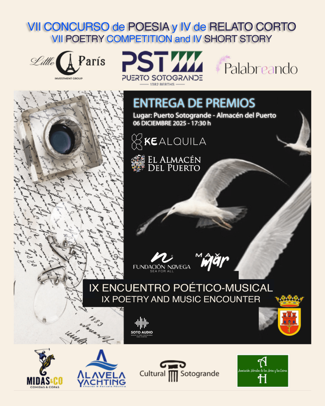 Sotogrande, 10 de noviembre de 2025.- El Almacén del Puerto, junto a la Plaza de los Naranjos en Puerto Sotogrande, o en caso de lluvia junto a las oficinas de la Torre de Control del propio puerto deportivo sanroqueño, acogerán el sábado 6 de diciembre a las 17:30 horas la entrega de premios del VII Certamen de Poesía y IV Certamen de Relato Corto Puerto Sotogrande, una cita que cada año reafirma el compromiso de la marina gaditana con la cultura, la creatividad y la promoción del talento literario vinculado al mar.