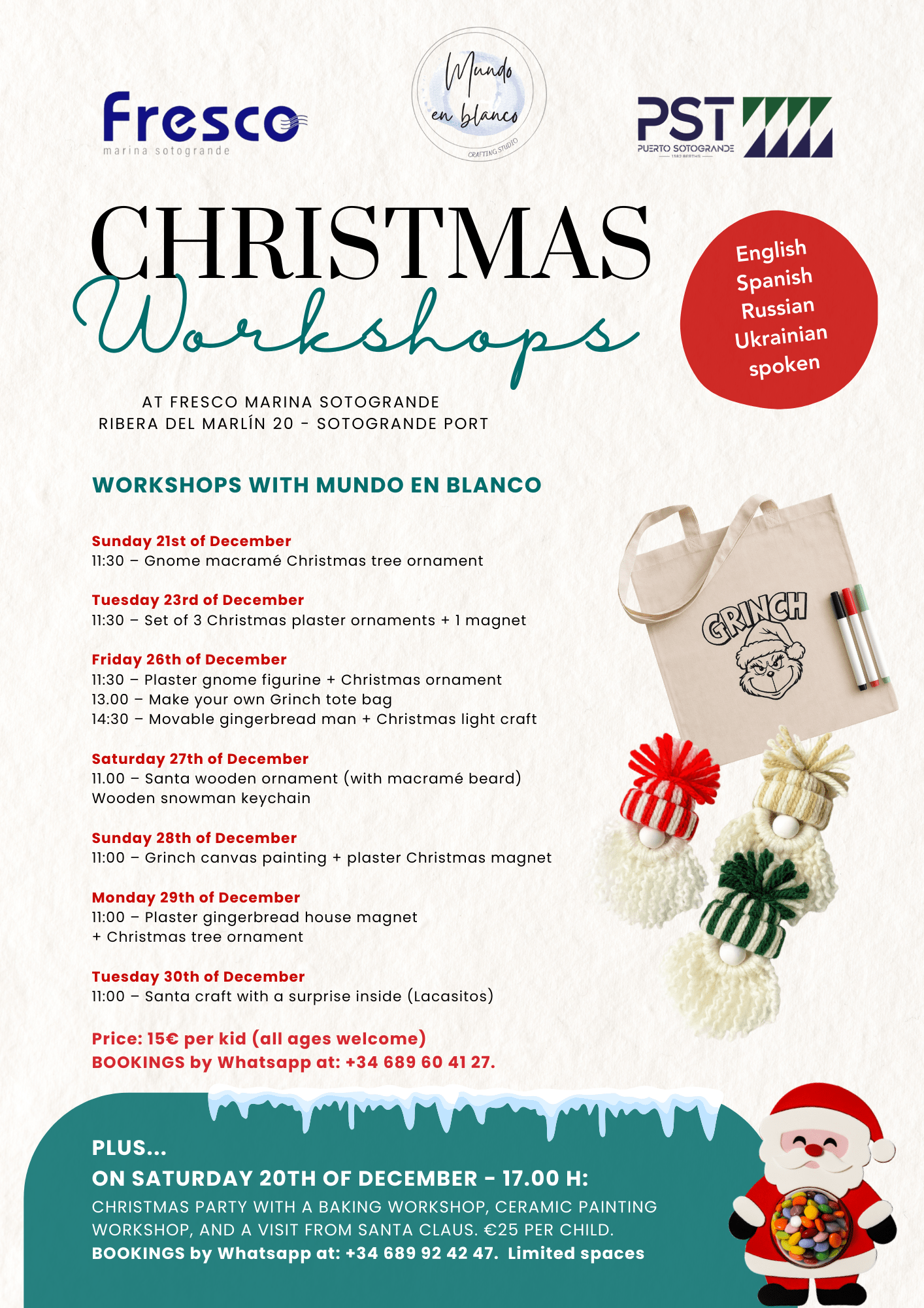 Sotogrande, 4 de diciembre de 2025.- Puerto Deportivo Sotogrande colabora con Fresco Marina Sotogrande en el desarrollo de un amplio programa de Talleres Infantiles con motivo de la Navidad, organizados junto al proyecto creativo Mundo en Blanco. Las actividades se celebrarán entre el 21 y el 30 de diciembre en las instalaciones de Fresco Marina, situadas en Ribera del Marlin número 20, dentro del recinto de Puerto Deportivo Sotogrande.
